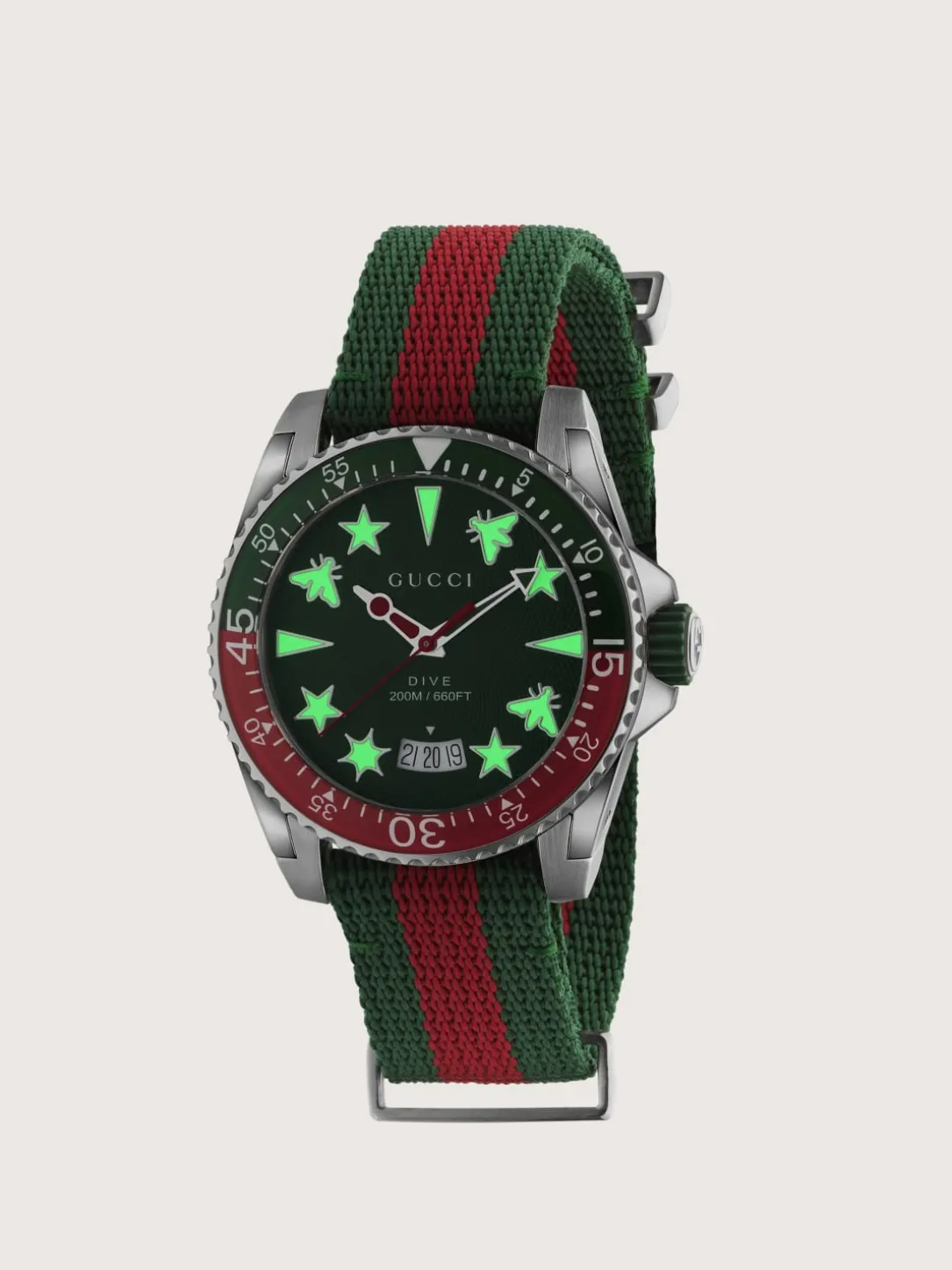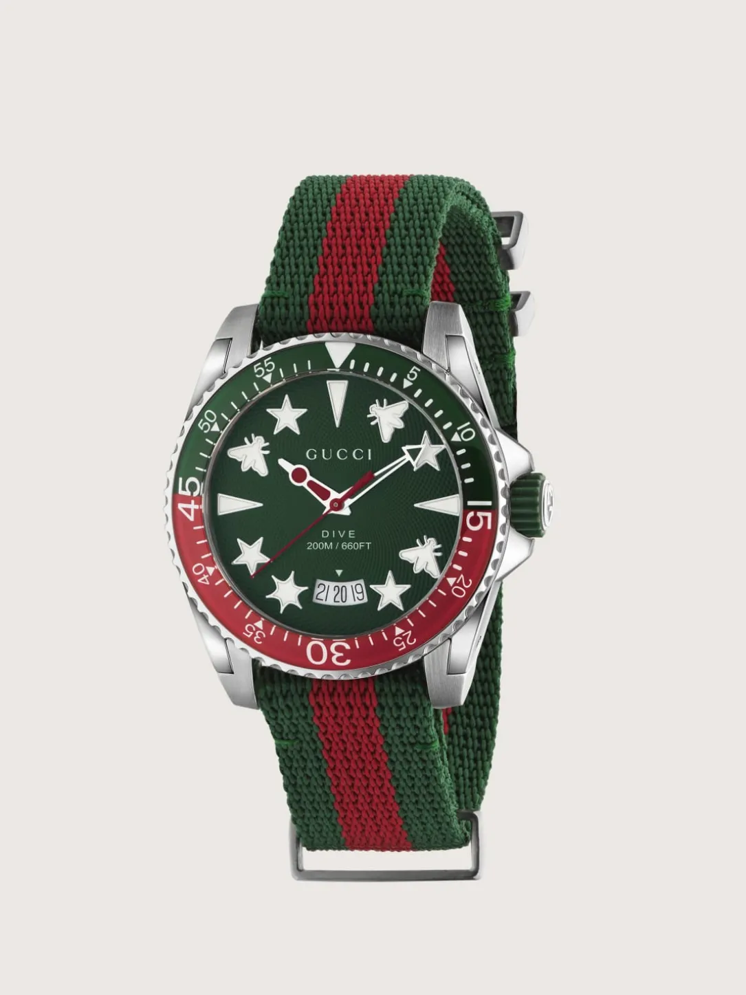 Steel case, green and red bezel, green rubber crown, green dial